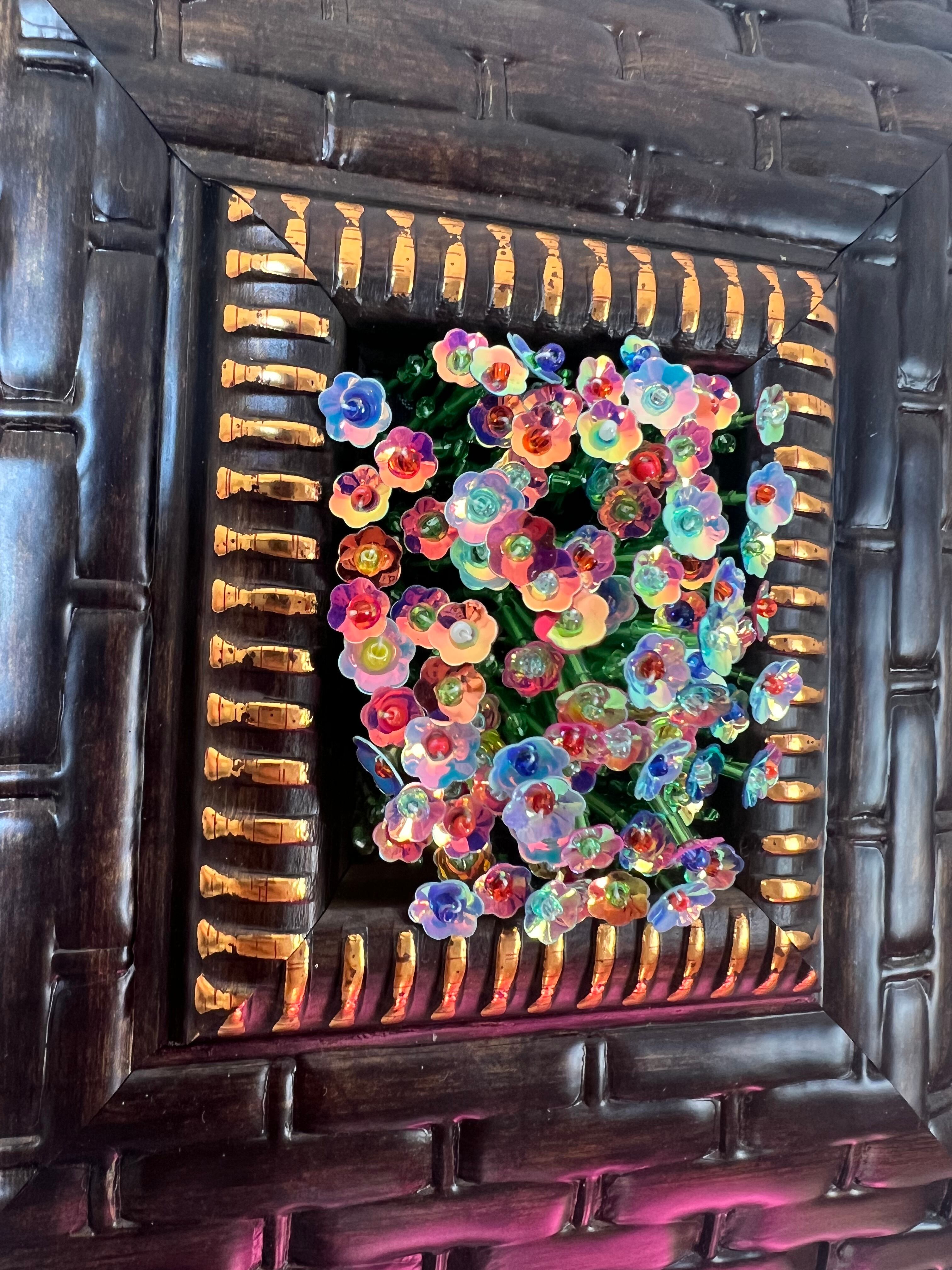 美しいお花畑の刺繍が施された壁掛けアート作品です。こちらの作品は、お花の華やかな色合いと繊細なデザインが特徴で、お部屋の雰囲気を明るくし、心を豊かにしてくれます。額縁の色合いも相まってナチュラルなインテリアにもぴったりと馴染み、癒しの空間を演出します。